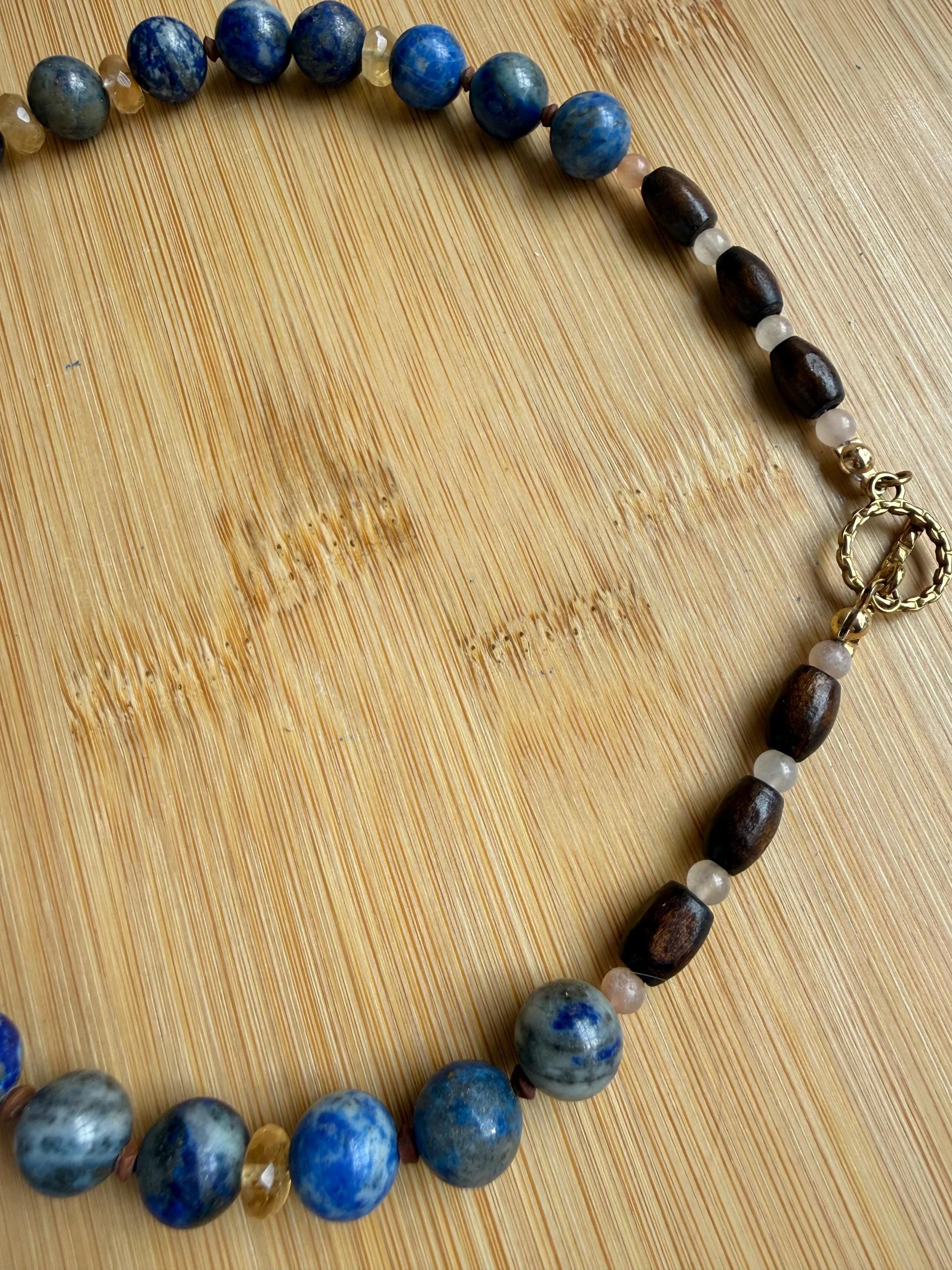 Shop › Lapis blue beaded necklace Image 1 of 4 Image 2 of 4 Image 3 of 4 Image 4 of 4 Lapis blue beaded necklace $69.00 Blue lapis and citrine beaded necklace featuring wood accents and an 18k gold PVD (non-tarnish) toggle clasp. Measures 18” Add To Cart Added! Blue lapis and citrine beaded necklace featuring wood accents and an 18k gold PVD (non-tarnish) toggle clasp. Measures 18”