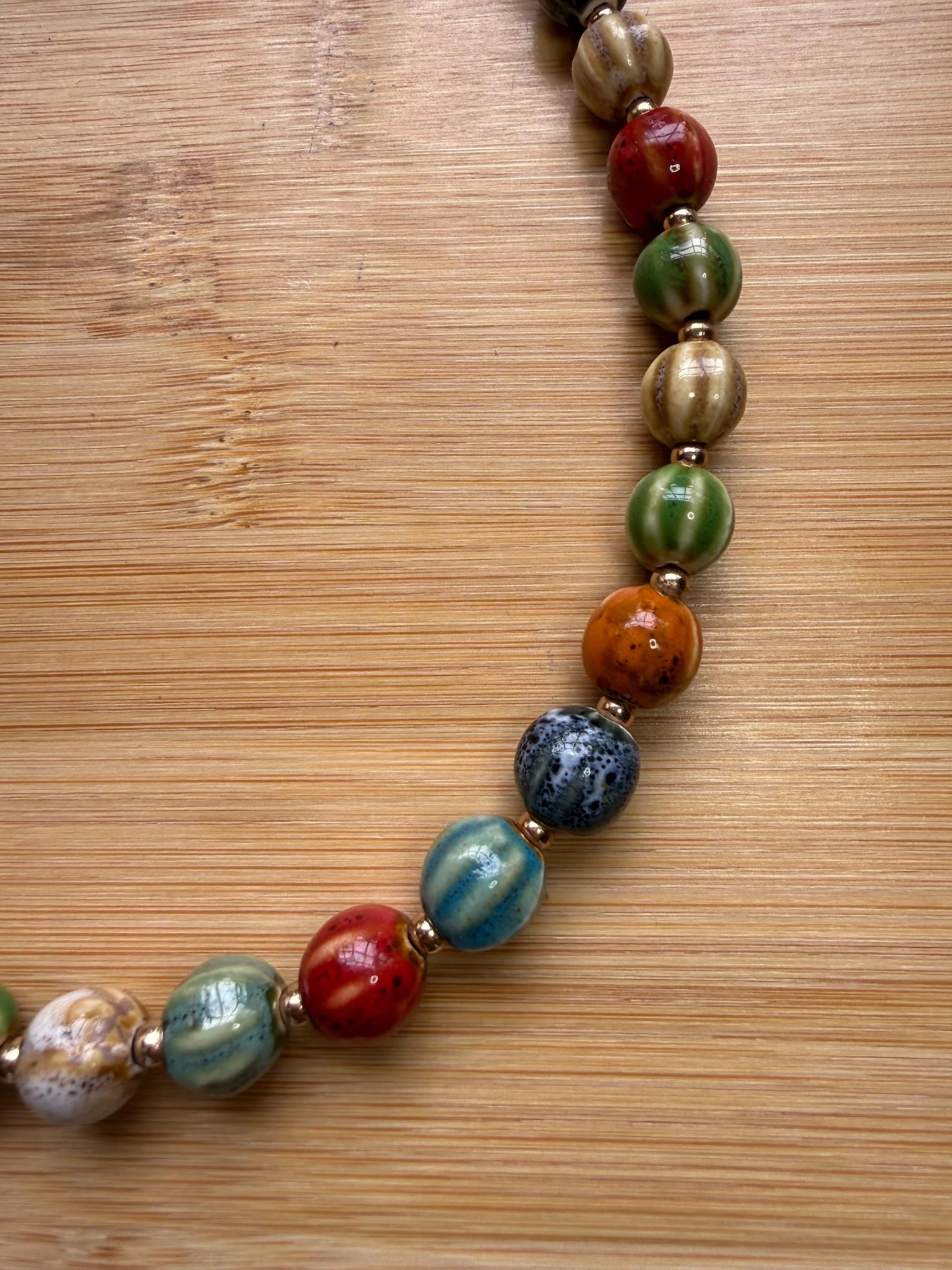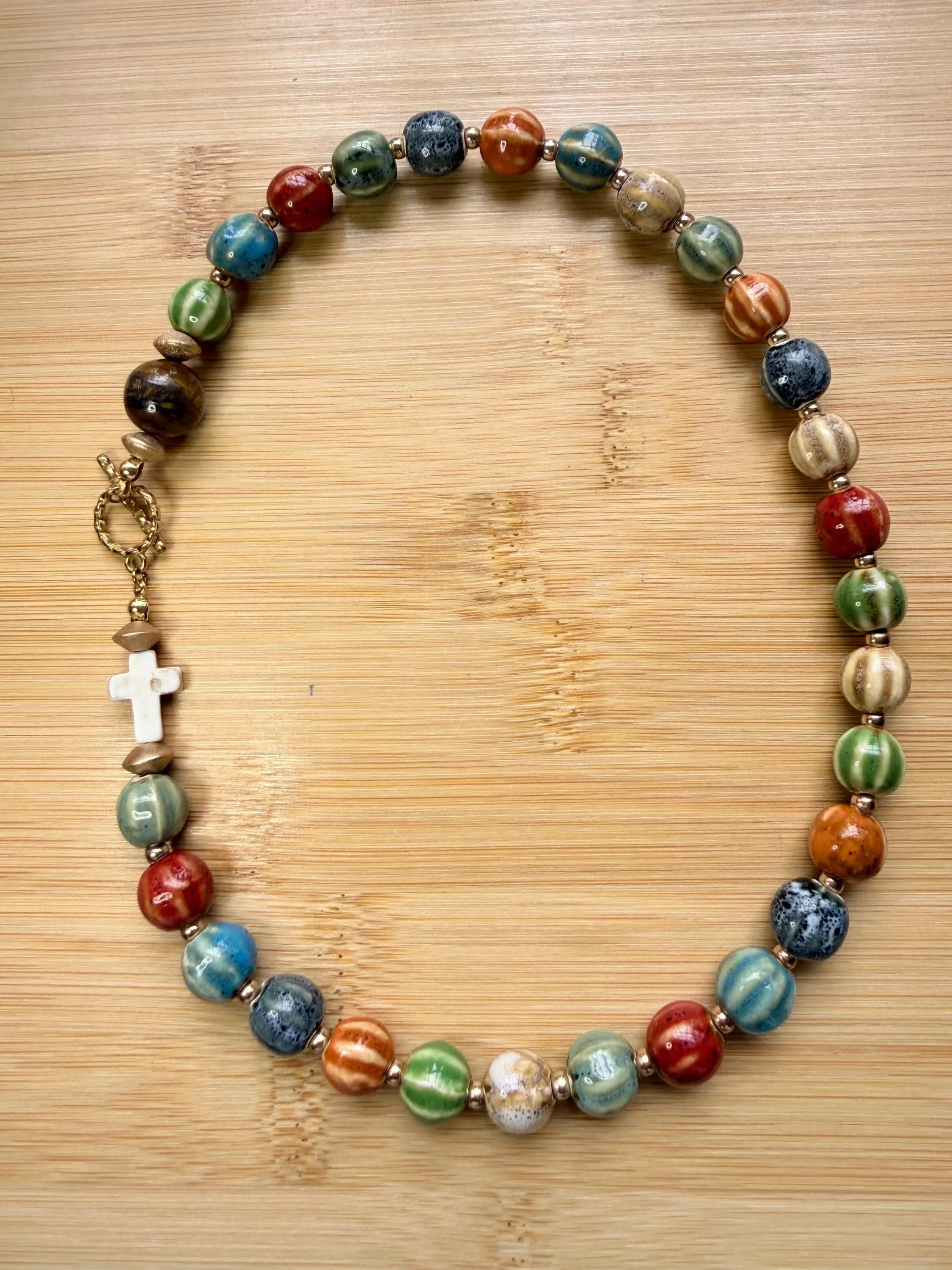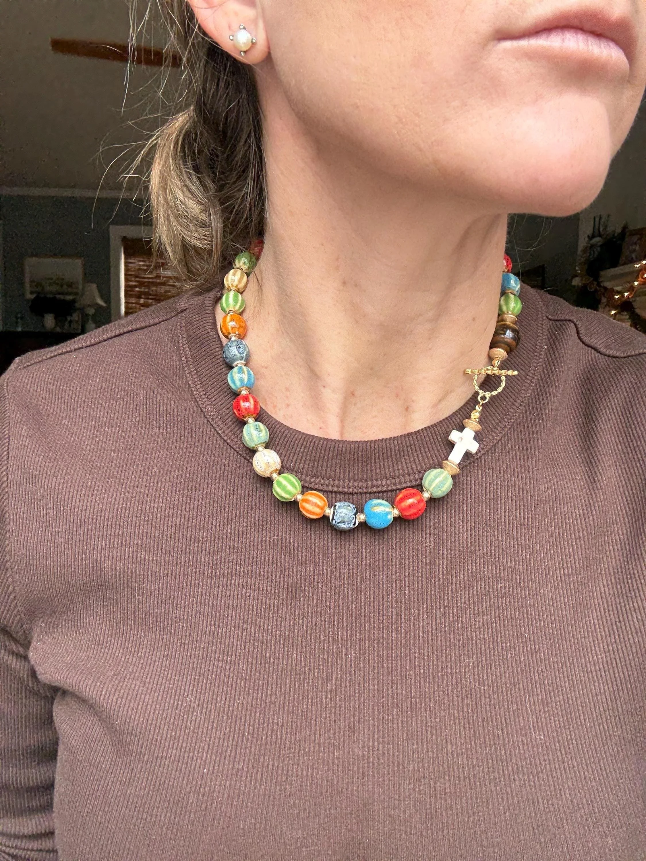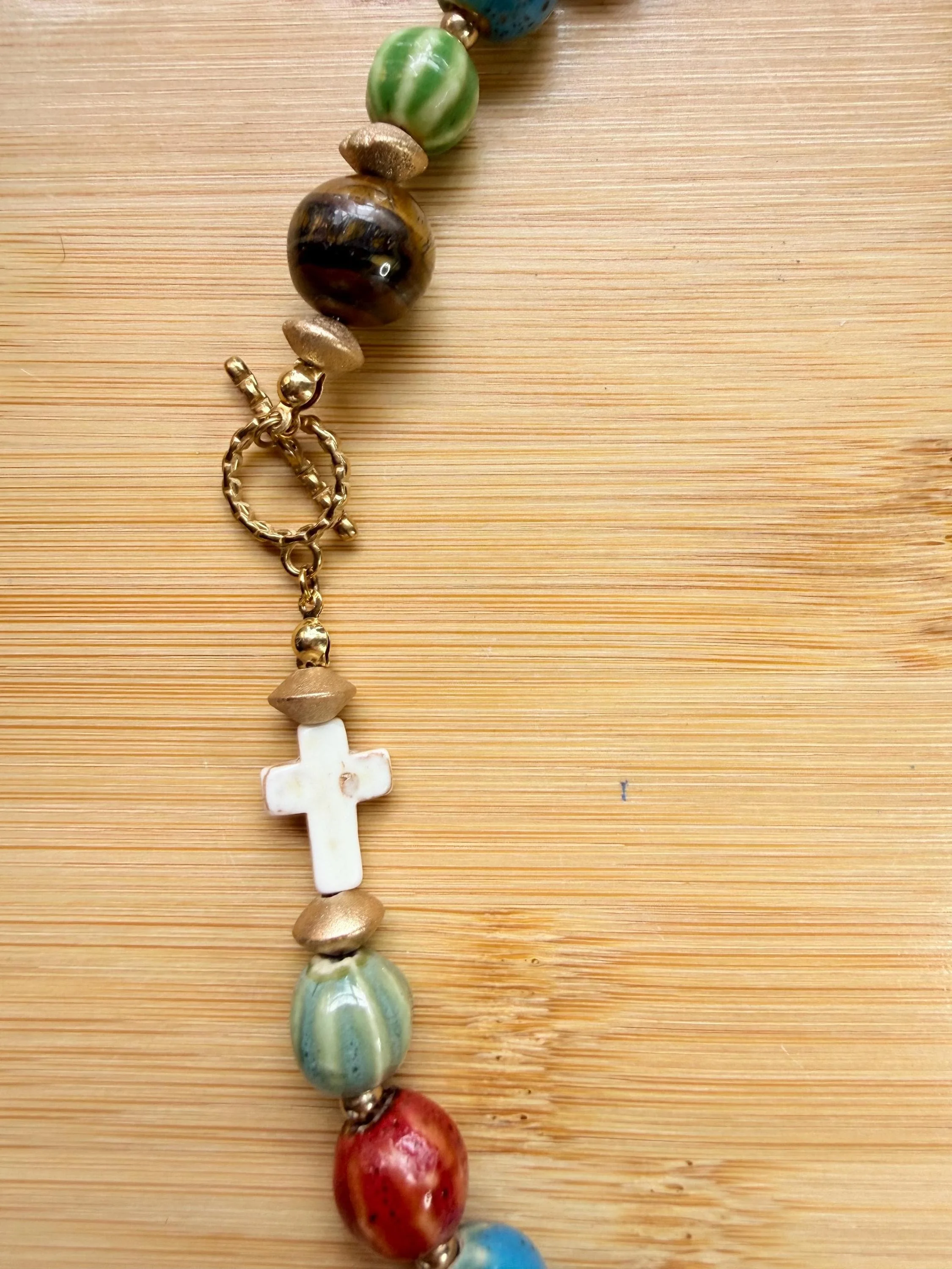 Shop › Multi-color beaded necklace Image 1 of 4 Image 2 of 4 Image 3 of 4 Image 4 of 4 Multi-color beaded necklace $69.00 Multi-colored glass beaded necklace with bone cross accent and 18k gold PVD (non-tarnish) toggle clasp. Measures 18” Add To Cart Added! Multi-colored glass beaded necklace with bone cross accent and 18k gold PVD (non-tarnish) toggle clasp. Measures 18”