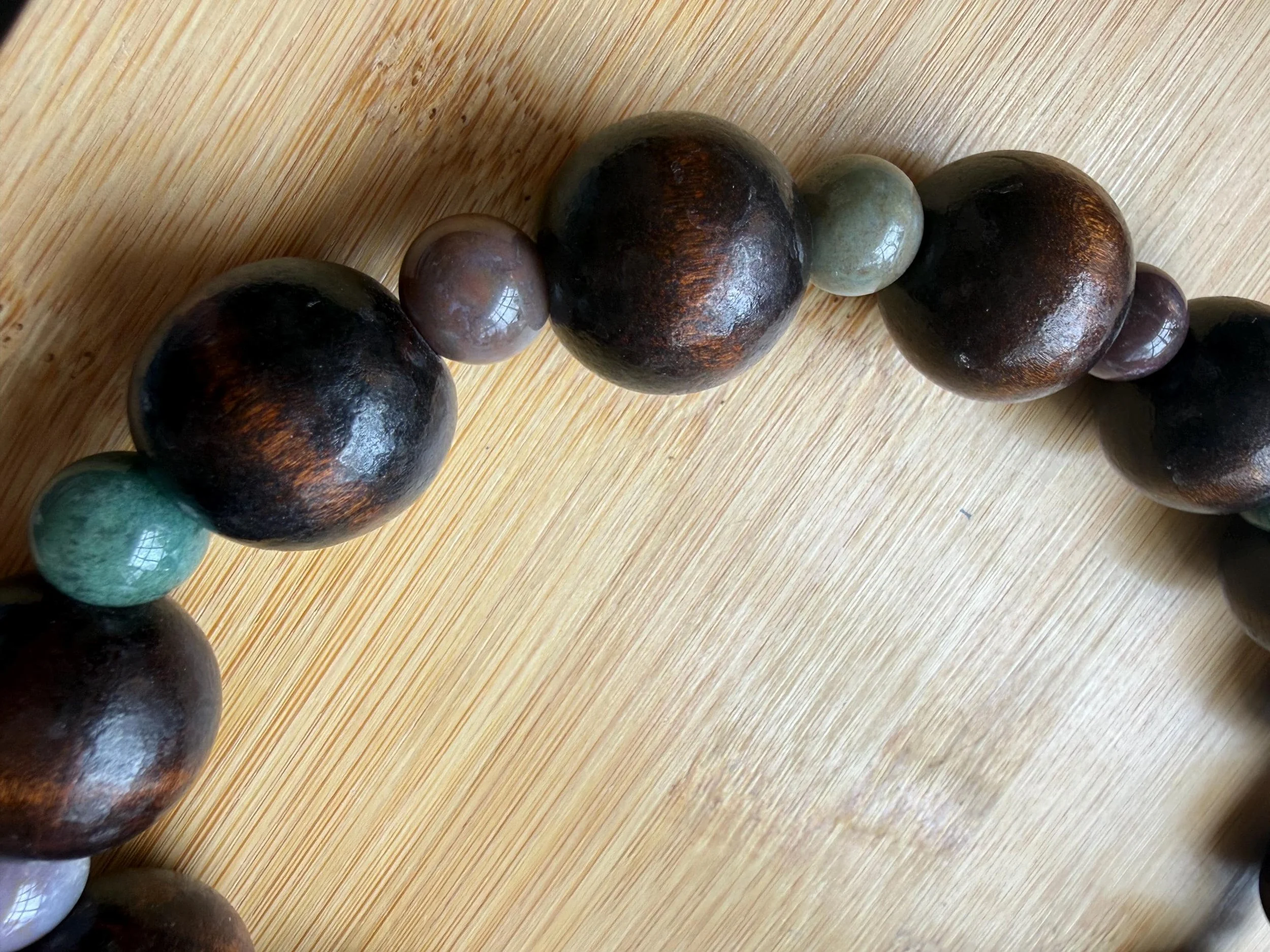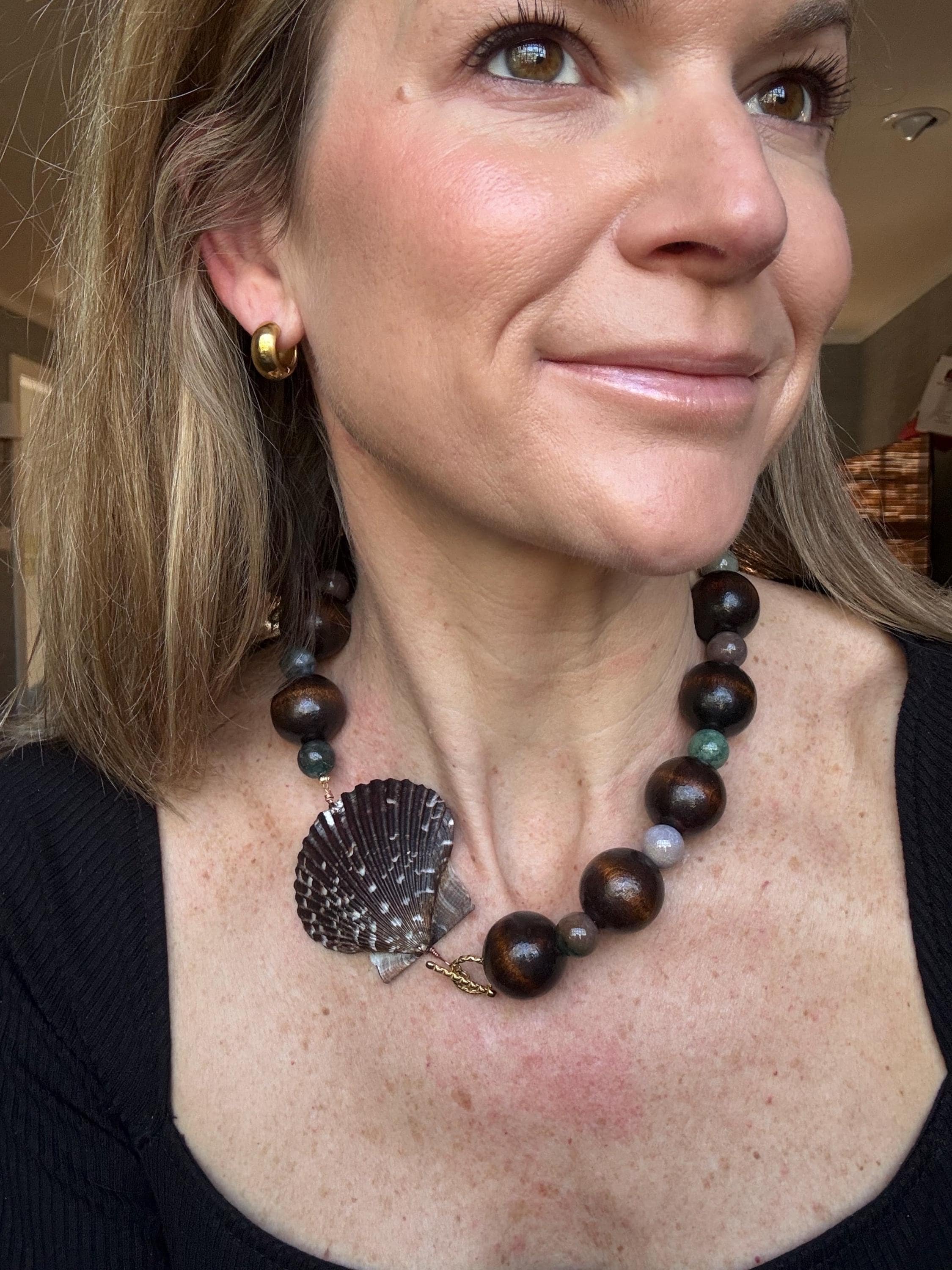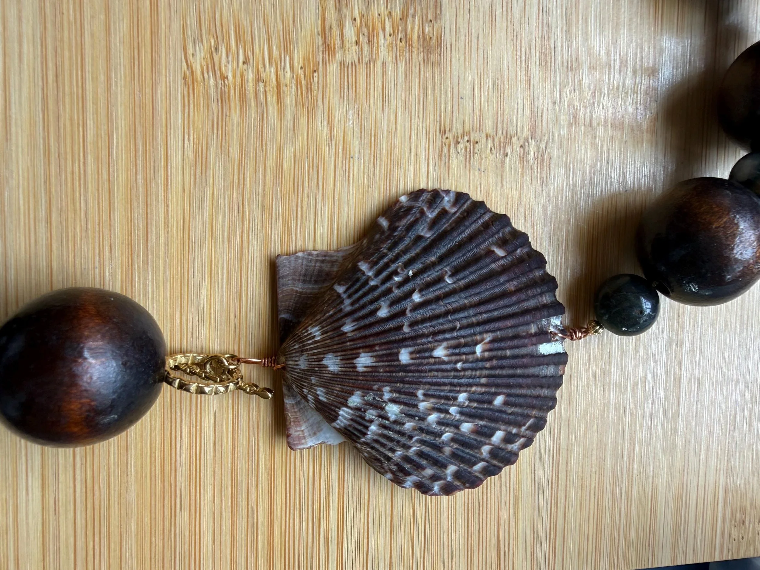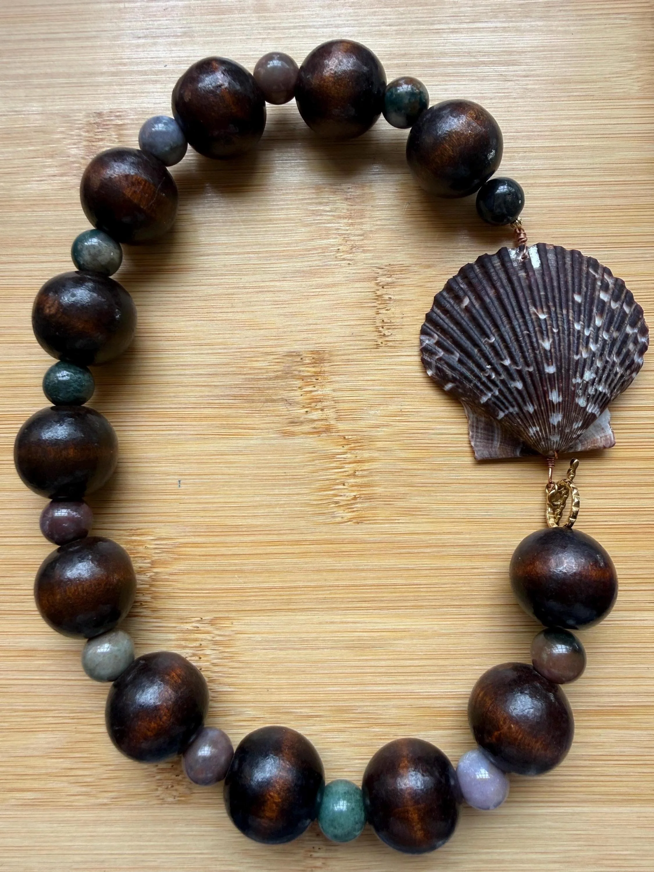 Glass and wood beaded necklace with 18k gold PVD (non-tarnish) toggle clasp featuring a natural scallop shell from the beaches of NC. Measures approx 19”