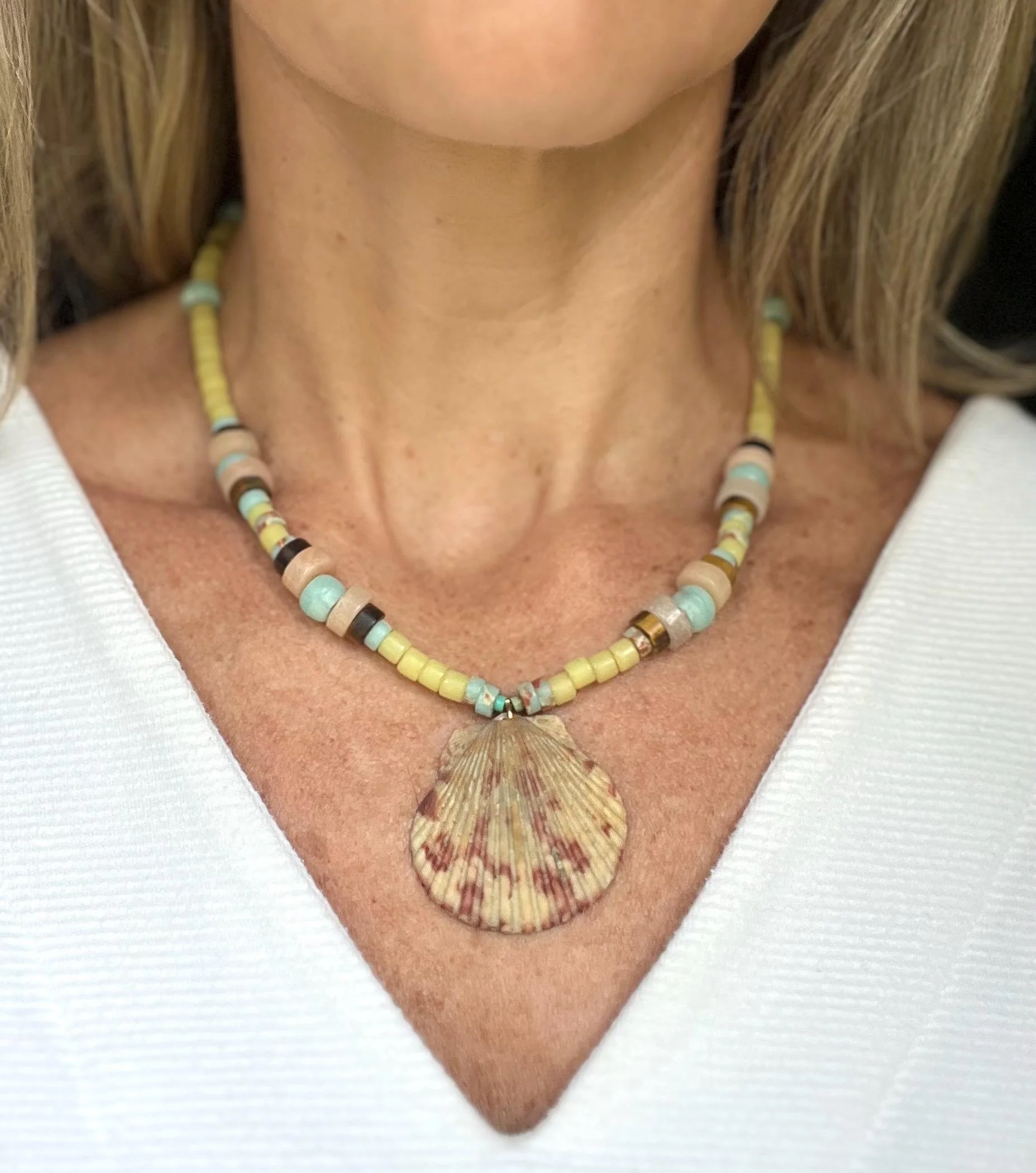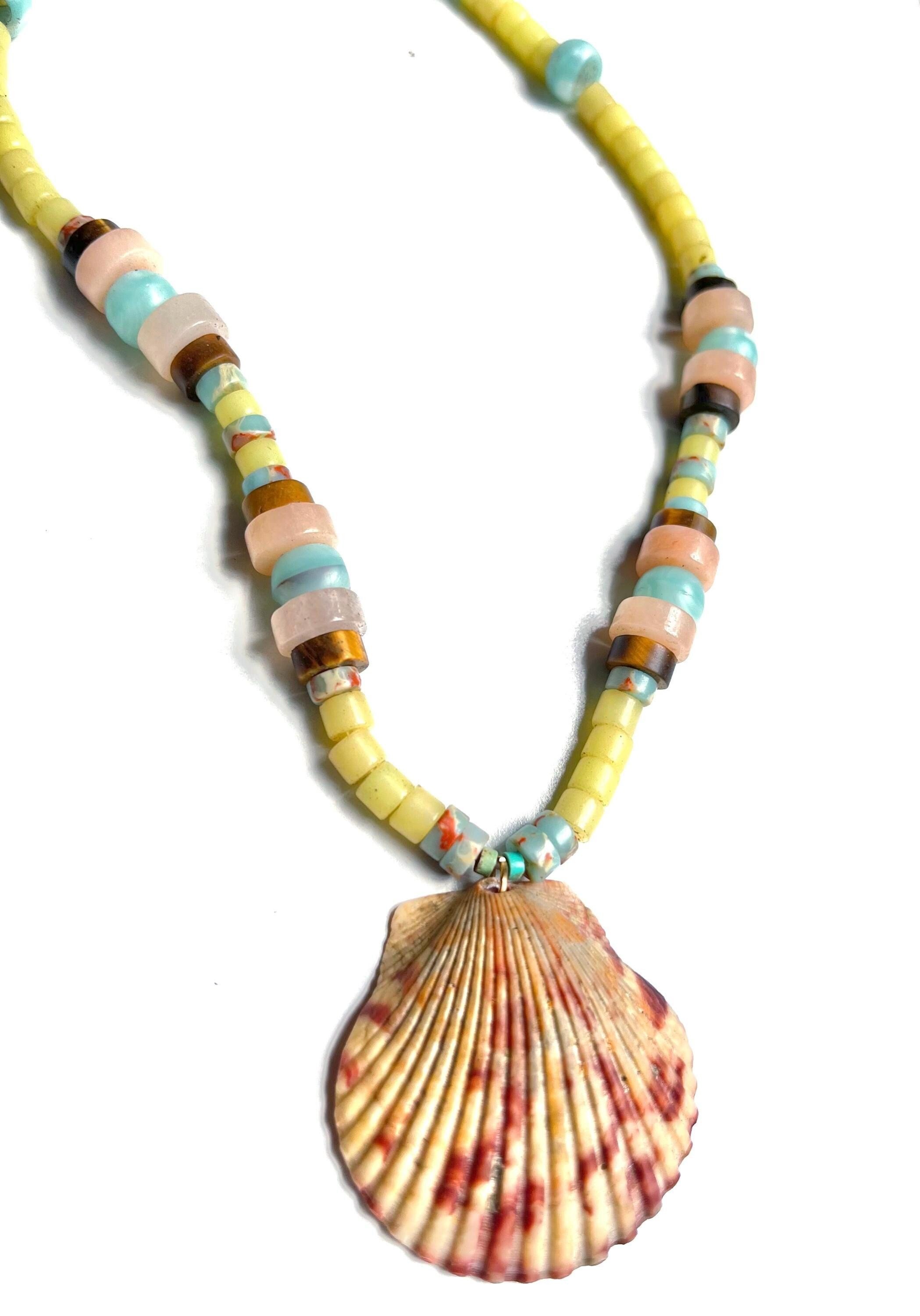 All shells locally sourced (by me!) from up and down the NC coast. This necklace features various glass beads, including some greens and turquoise making it really versatile.