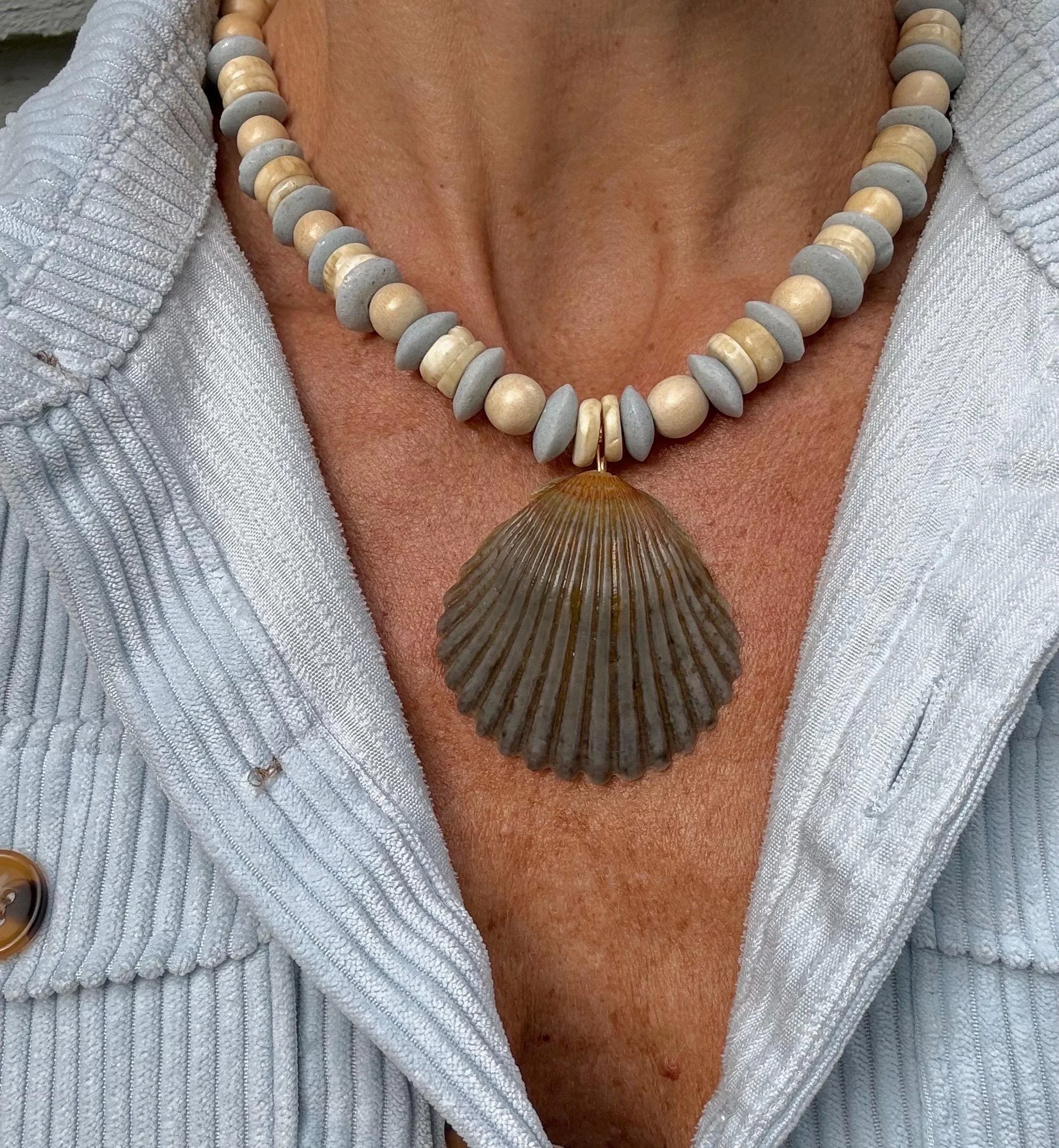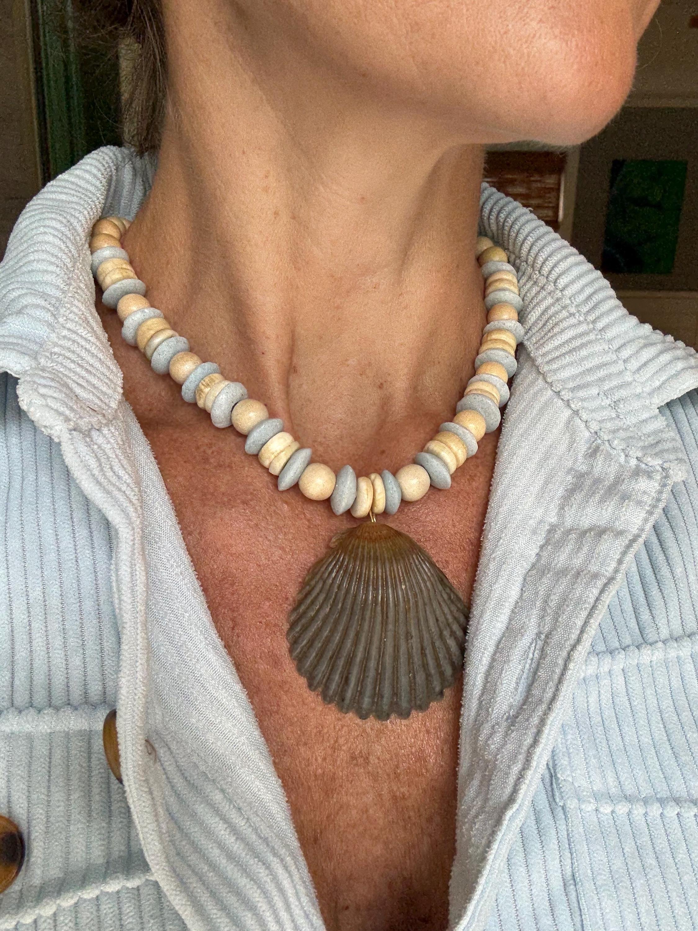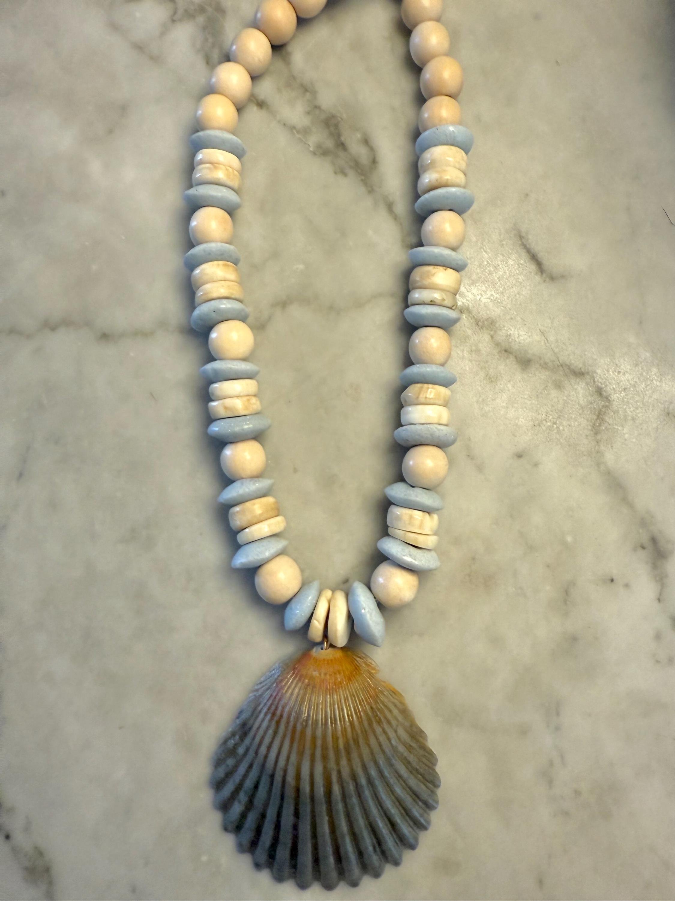 All shells locally sourced (by me!) from up and down the NC coast. This necklace features pale blue African glass Ashanti beads with bone and wood accent beads. Neutral and versatile with cool girl chic vibes.