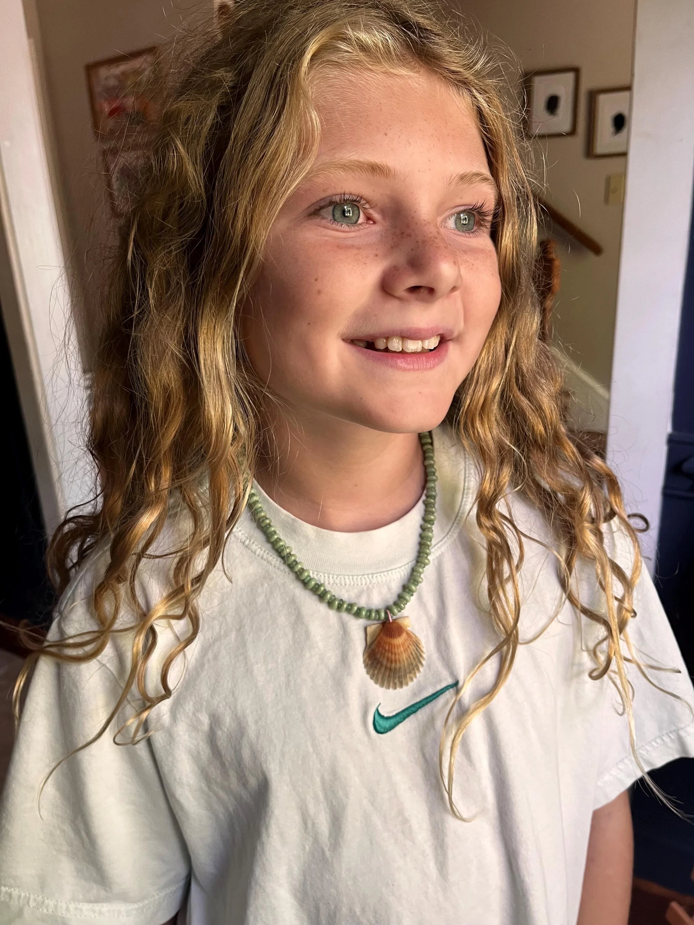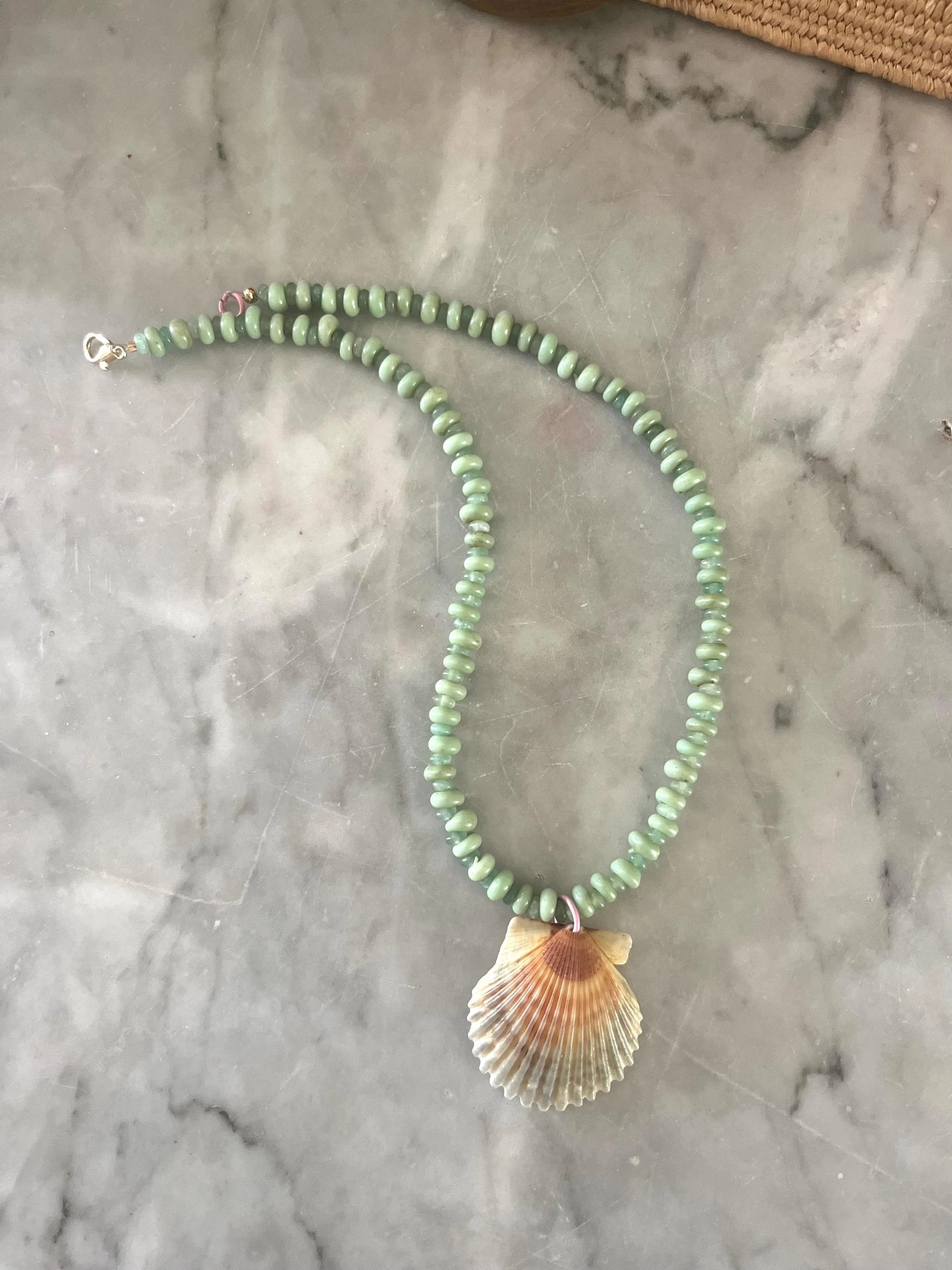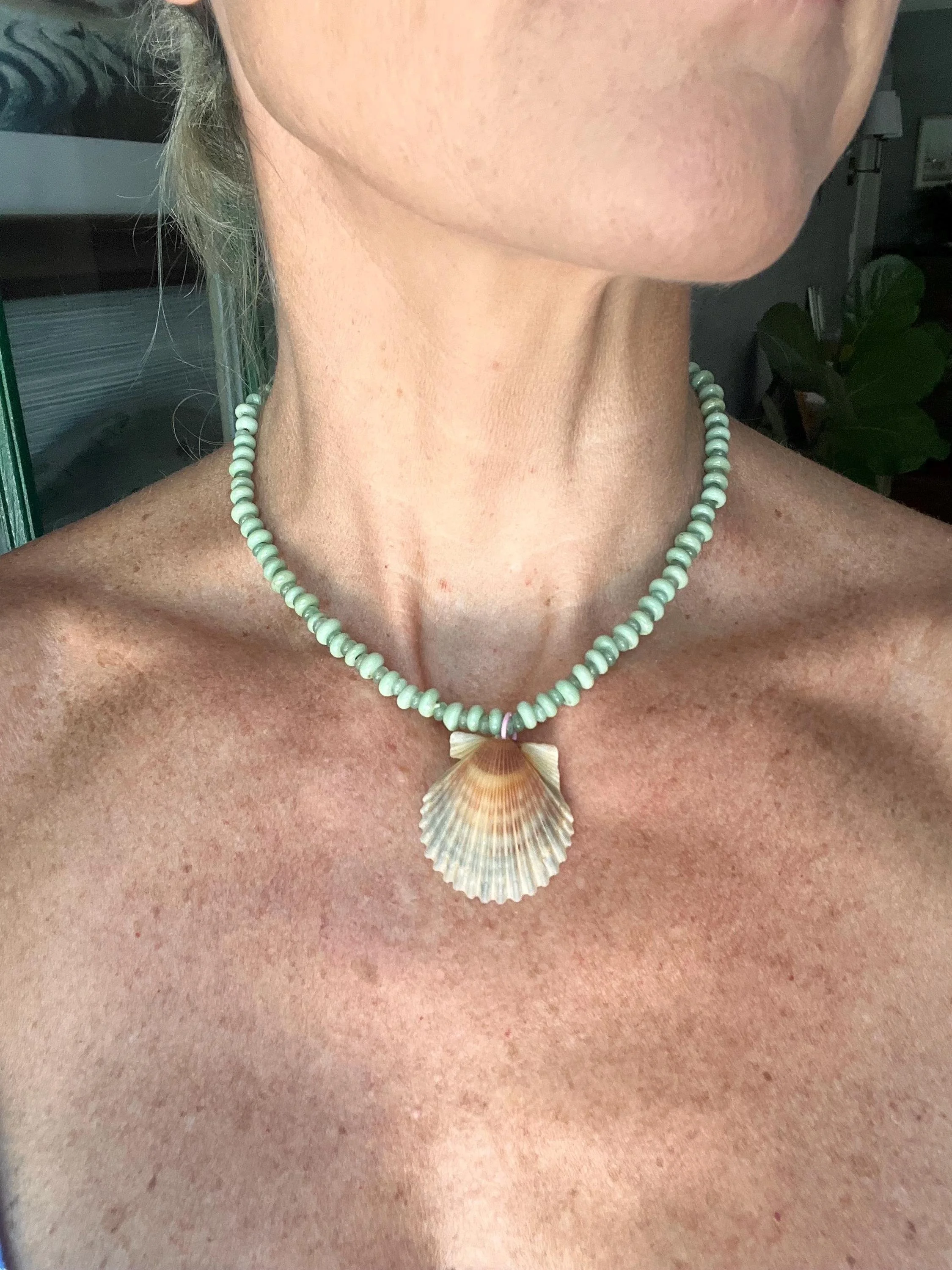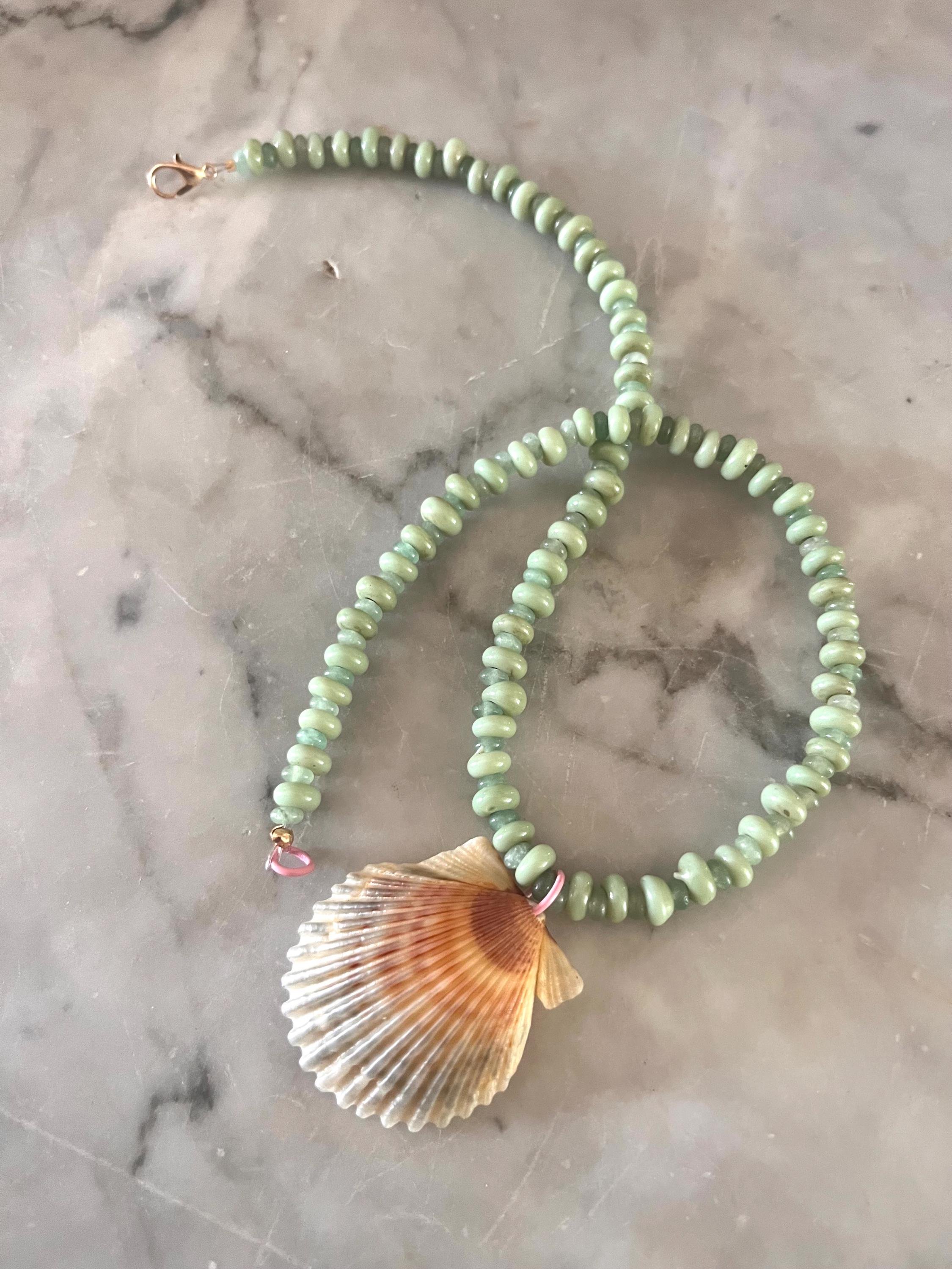 All shells locally sourced (by me!) from up and down the NC Coast. This design features gorgeous sea green glass rondelle beads with cute pink accents. A smaller size perfect for girls and teens, and a shorter length for adults. See photos for size reference.