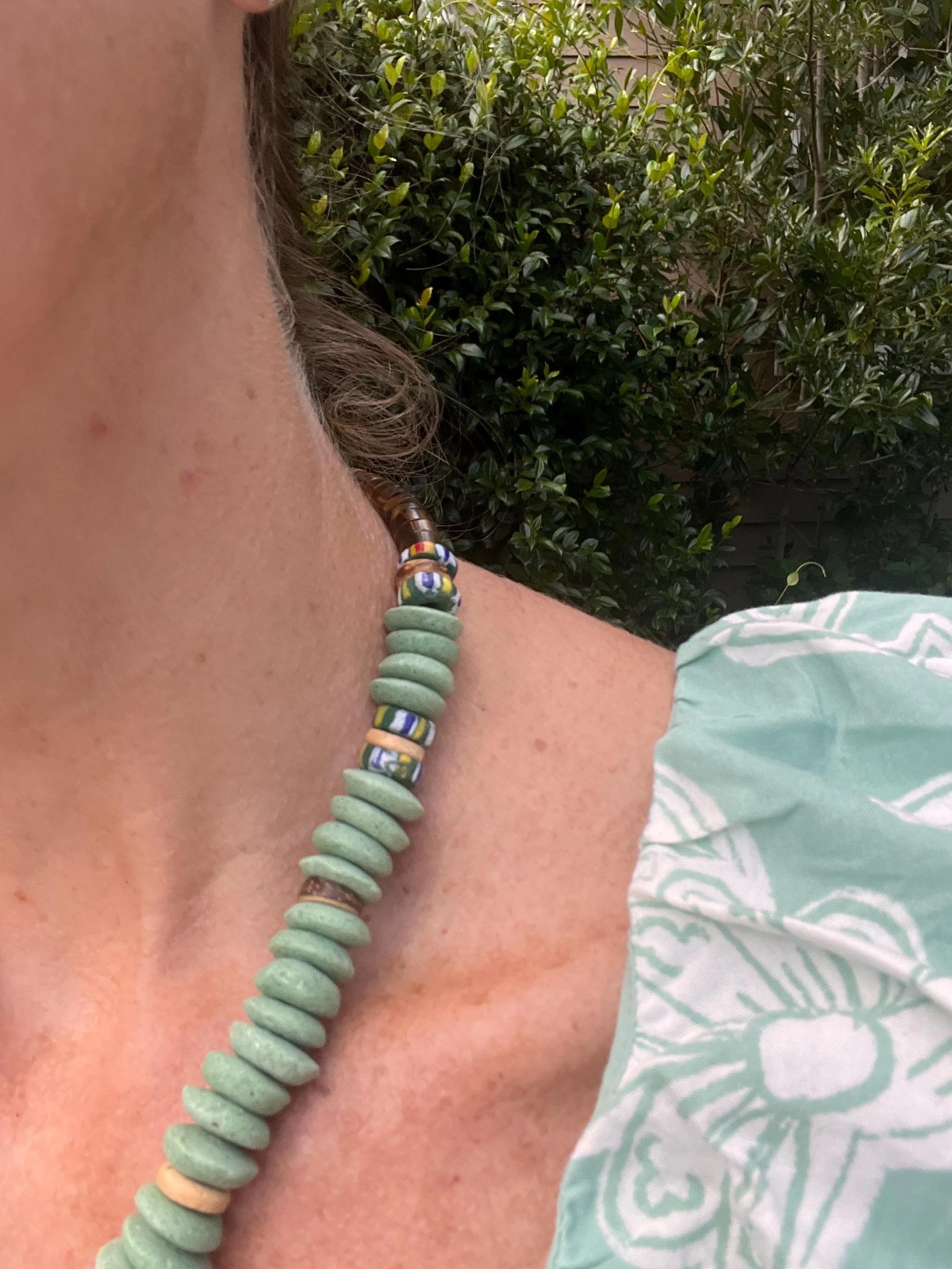 All shells locally sourced (by me!) from up and down the NC coast. This design features gorgeous painted and green colored glass Ashanti saucer beads. The process of making these beads is unique to Ghana, Africa for over 1000 years! This is our most popular design.